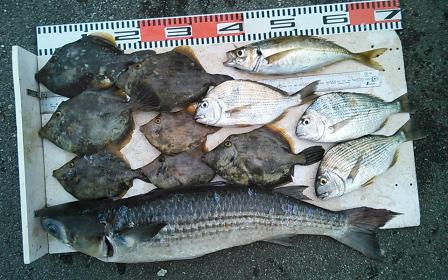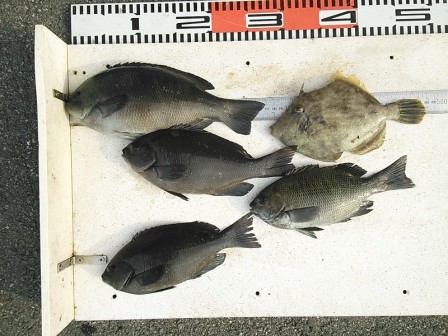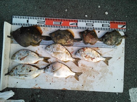 5月30日 豊田様 筏でチヌ45cmまで3尾(餌:オキアミ、コーン、サナギ) 他 カワハギ、ボラ |