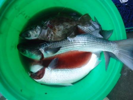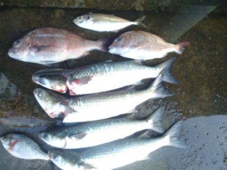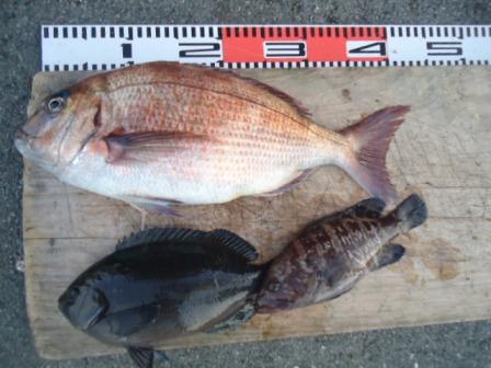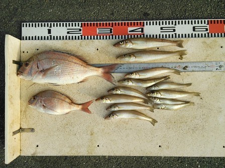 3月28日 塚原様 筏で真鯛 40cmまで2尾 アジ30cm 1尾 他 ボラ |
