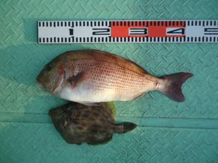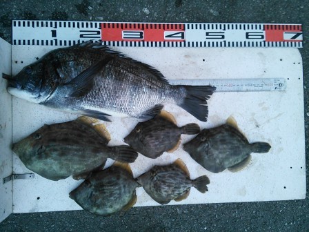 4月9日 浅井様 筏で真鯛 44cm 1尾 他 カワハギ、ボラ |
