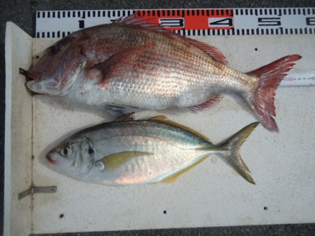 4月21日 島津様 筏で真鯛 54cm 1尾 シマアジ42cm 1尾 |
