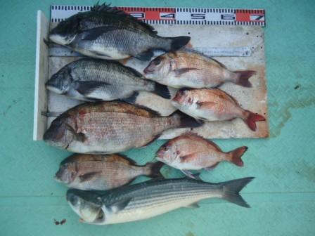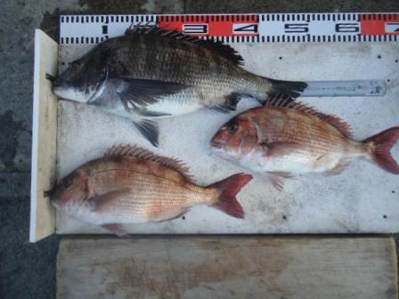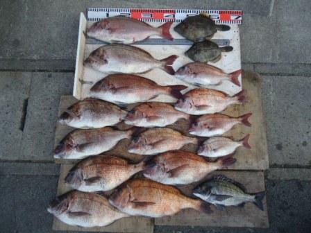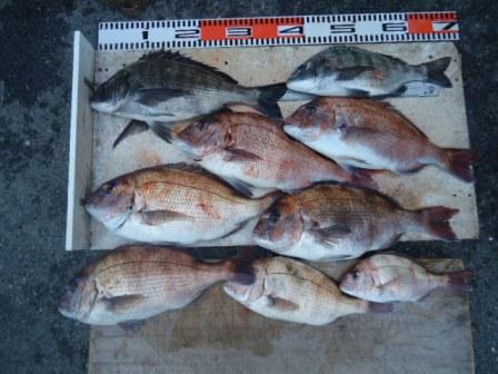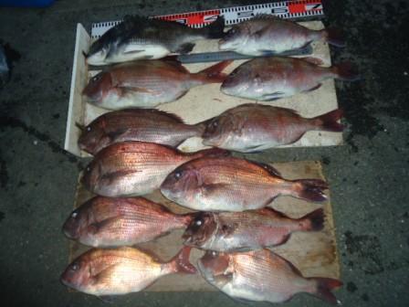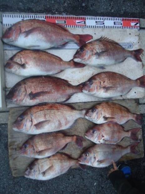 3月16日 岡田様 筏でチヌ 44cm 1尾 真鯛37〜44cm 11尾(餌:ボケ、むき身) |
