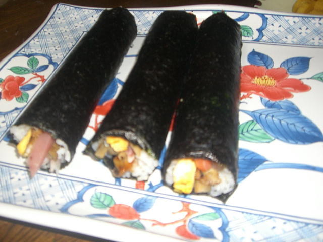 夕飯は、恵方巻にちなんで、魚いっぱい(サーモン、まぐろ、かんぱち、あなご、)の太巻きを、母に作ってもらいました。今年の恵方に向いて丸かじり!!とはいかず、切って食べました。